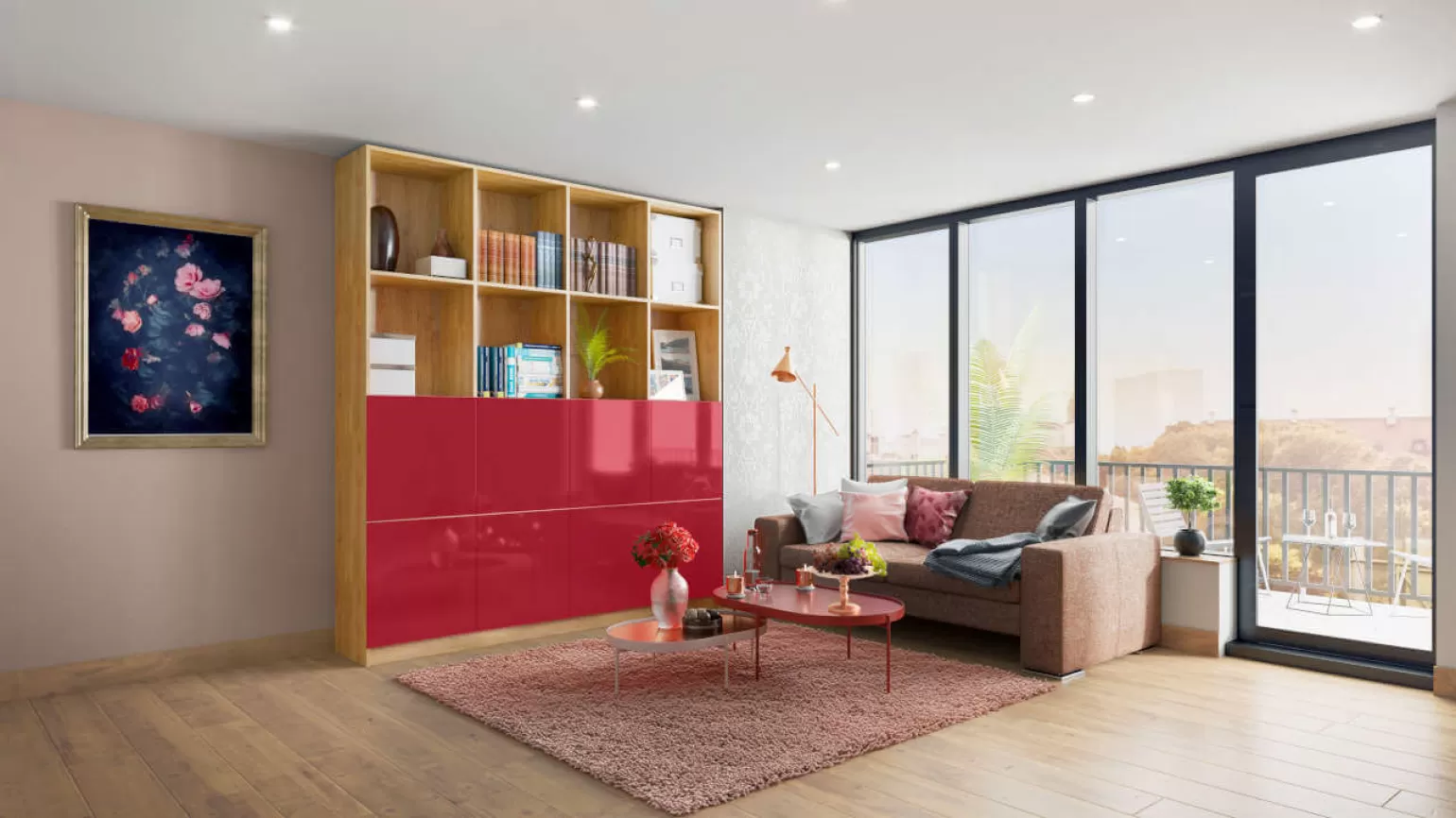 Das Bücherregal mit Türen wird durch die besondere Optik der Hingucker im Wohnzimmer.