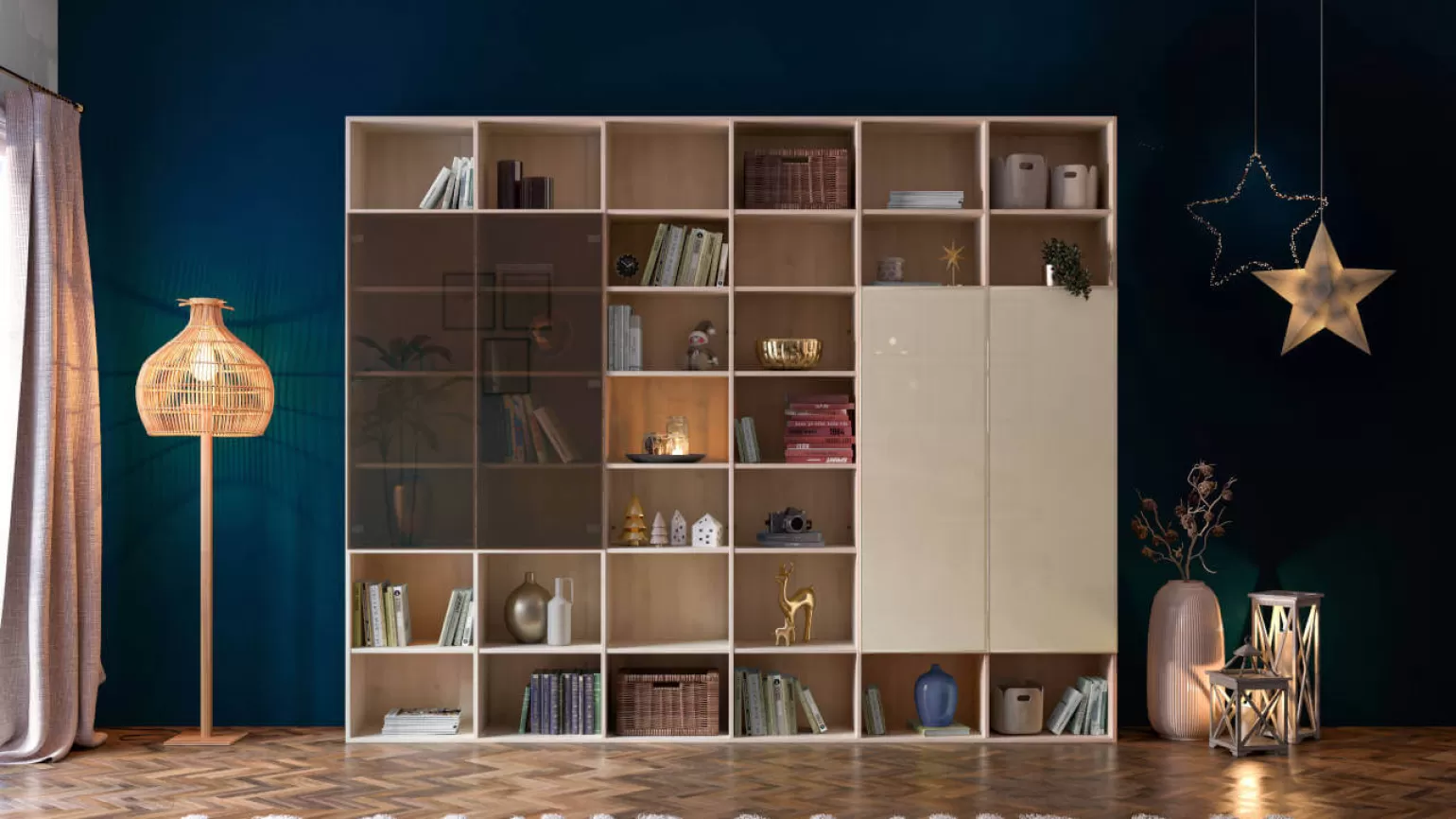 Das Bücherregal wurde mit vier Türen konfiguriert und bietet viel Platz für die private Bibliothek.