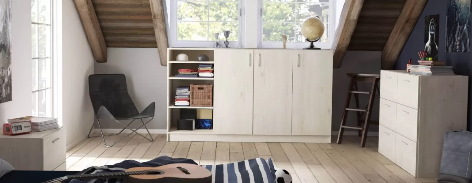 Die Kommode im Dekor Pinie gekalkt mit Schräge hinten fügt sich perfekt in die Dachschräge und bietet Platz für viele Kleinigkeiten.