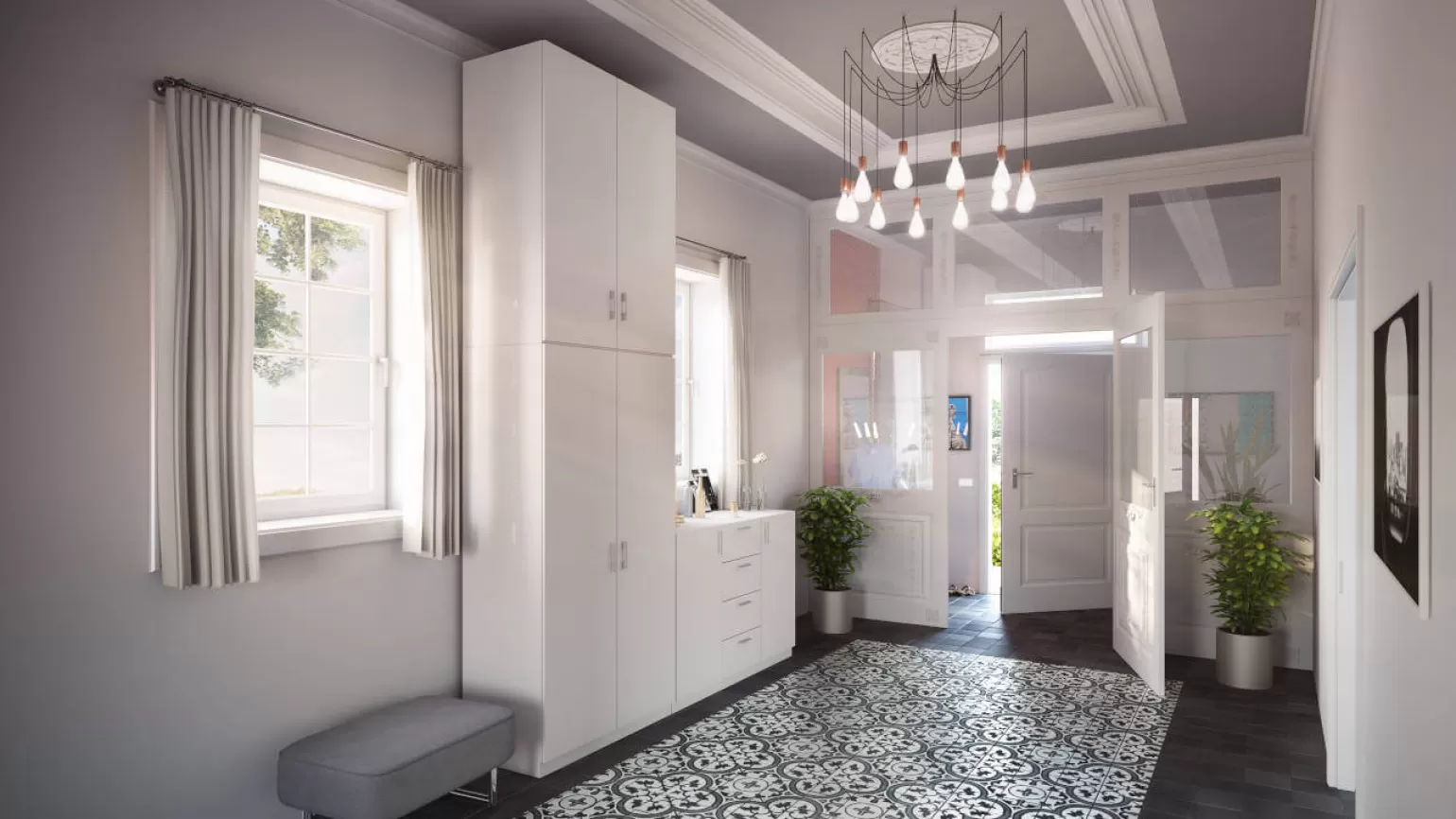 Die Schuhkommode im Flur wird von der Nischengarderobe perfekt ergänzt.